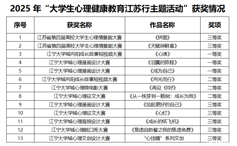 活动期间,我校组织师生参加了“校园危机中的家校工作”交流研讨会、江宁大学城首届“高校学生心理骨干工作研讨论坛”等,汲取前沿理念与实践经验;依托江宁大学城的区域心理健康教育资源,承办了江苏省江宁大学城大学生心理健康教育研究中心的高校专兼职心理咨询师督导活动,有力促进了专业队伍能力提升;积极搭建省、区级心理活动平台,广泛动员并组织学生参加了江苏省和江宁大学城各级各类比赛,斩获多项荣誉,成果斐然,提升学生心理健康水平。
